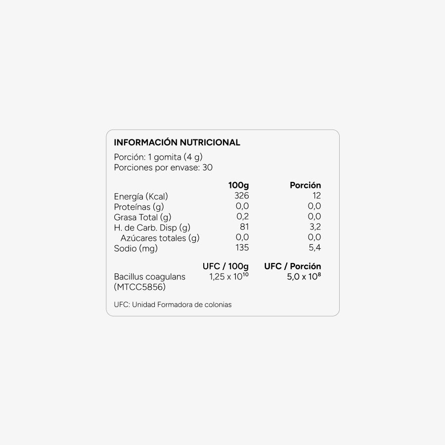 Cada gomita aporta 5,0 x 10⁸ UFC de Bacillus coagulans, una cepa altamente resistente a los ácidos gástricos y biliares, lo que le permite sobrevivir en el tracto gastrointestinal y ejercer sus beneficios de forma efectiva. Este probiótico ayuda a favorecer la flora intestinal, fortalecer la barrera del epitelio intestinal y contribuir al adecuado funcionamiento del sistema inmune.